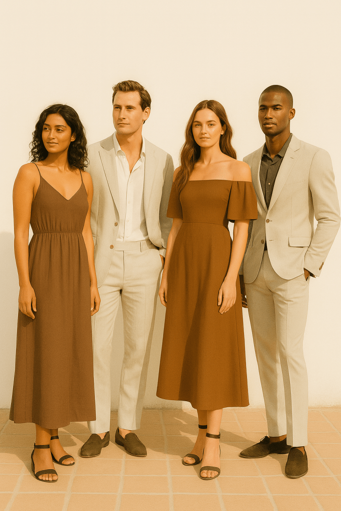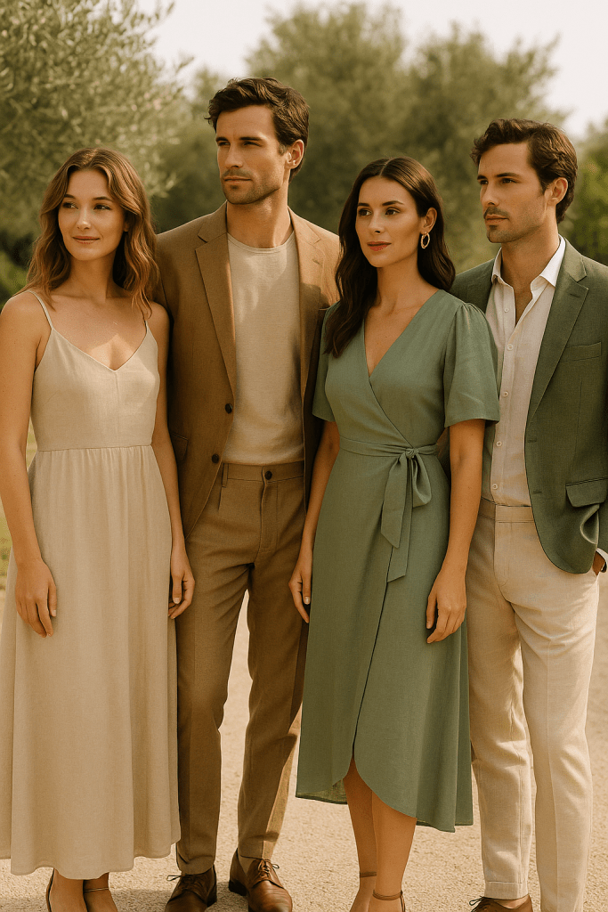 Die Farben und Texturen sind inspiriert von den sanften Tönen von Olive🫒, Sand⛱️ & Rosé🍷– eine perfekte Mischung aus mediterranem Chic und legerer Eleganz. Denkt an leichte, luftige Stoffe wie Leinen in Kombination mit edlen, natürlichen Akzenten. Der Look sollte entspannt, aber dennoch elegant sein – ideal für eine Feier im Freien, Sand und unter der warmen Sonne.